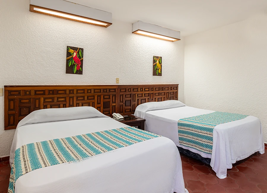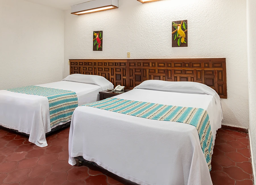 Habitación decorada estilo Colonial con dos camas matrimoniales con capacidad hasta para 4 personas.